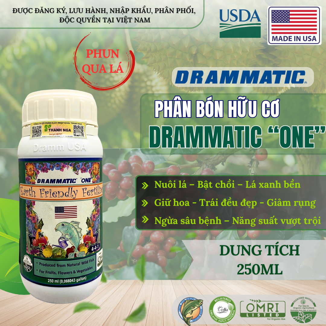 Phân Drammatic là sản phẩm phân bón hữu cơ hoàn toàn tự nhiên có nguồn gốc từ cá, rong, tảo bẹ được khai thác từ Ngũ Đại Hồ (Great Lakes), Hoa Kỳ. Sản phẩm chứa nhiều loại dầu tự nhiên, axit amin, chất dinh dưỡng và khoáng chất có trong cá. Sản phẩm được chứng nhận hữu cơ quốc tế OMRI và chứng nhận hữu cơ Hoa Kỳ.